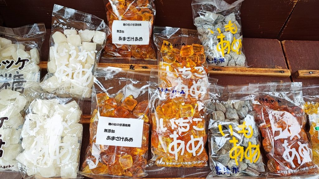 飴屋さんの棚には、色とりどりの飴が並んでいた。どれも美味しそうで迷ってしまう。