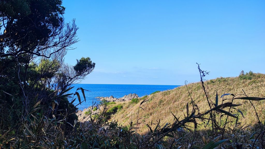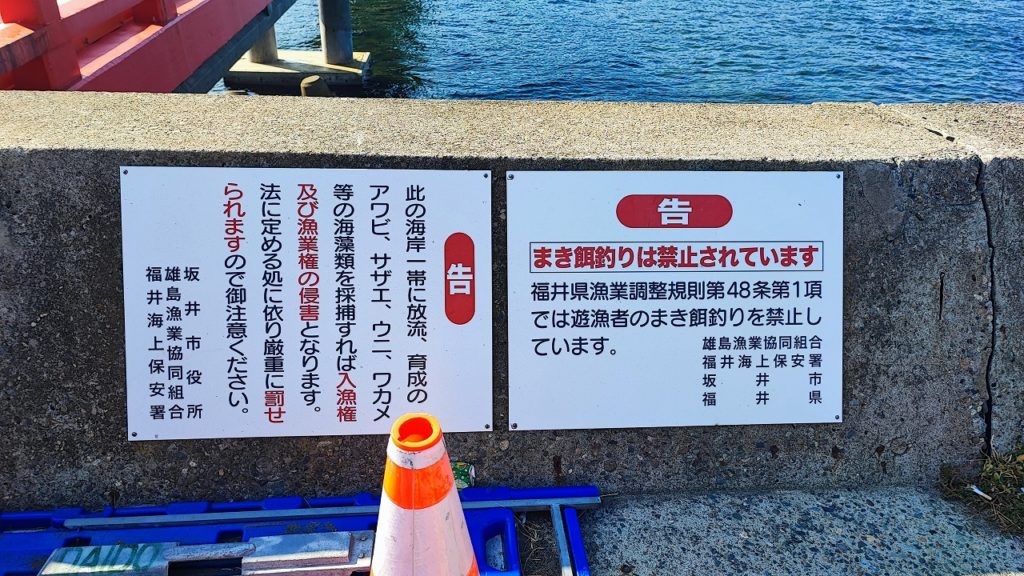 アウトドアショップから30分ほどの場所にある雄島にも立ち寄ることに。駐車場にはトイレも併設されていて安心して利用できる。車を止めて島へと渡る細い橋を渡ると、遠くには東尋坊が見えて景色が非常に良い。橋から海を覗くと、たくさんのフグが見える。これではワームを使っての釣りは無理だと思うほどのフグの多さ。