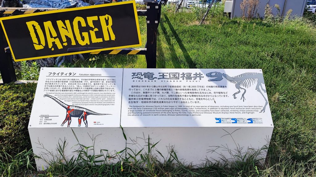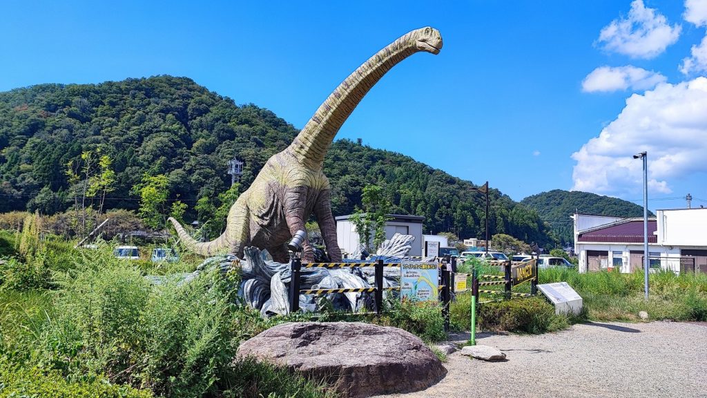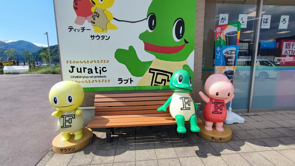 お腹も満たしたところで、友人が行きたいという福井のアウトドアショップへ向かう。高速道路で1時間40分ほどのドライブ。途中、新しいげなサービスエリア「南条SA (下り)」で休憩のために立ち寄ったのだが、なかなか力の入ったサービスエリアで、大きな動く恐竜が目を引いていた。