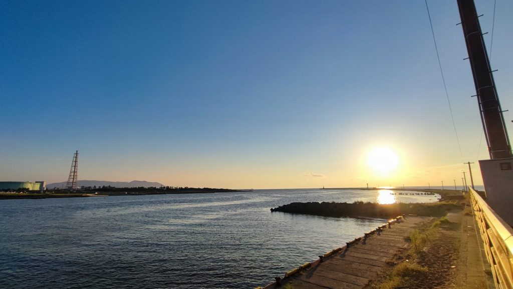 温泉から見える景色は九頭竜川河口で、夕日がとても綺麗なスポット。九頭竜川河口でぜひ一度釣りをしてみたいと思った。