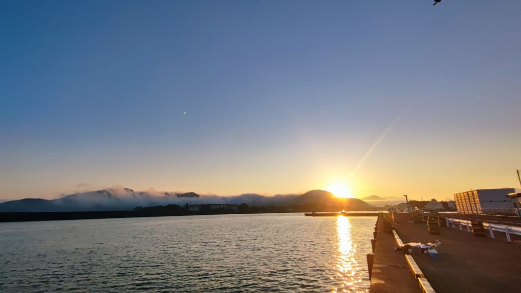 さて、小浜港で朝5時に起床。まだ薄暗い中、着替えて朝マズメで魚を狙うことに。山の方から霧が流れてきていて、幻想的な雰囲気。