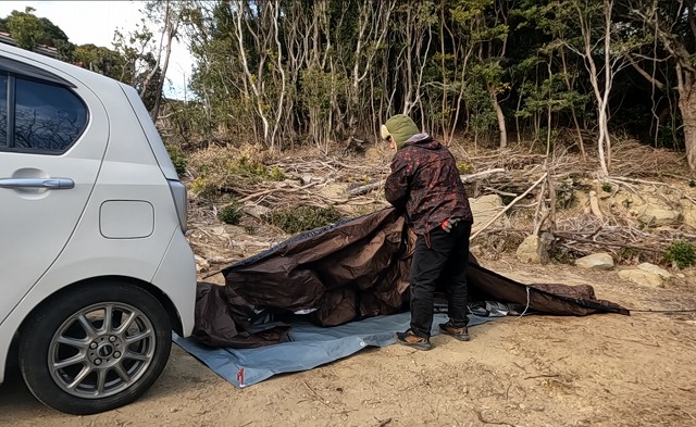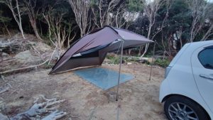 ここで、先日購入し楽しみにしていた 「FIELDOOR カーサイドシェルタータープ」を設置してみることにした・・・のだが!?