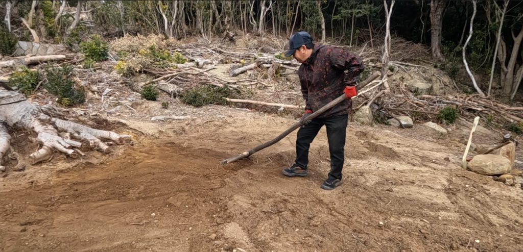 なんとか根の除去を終え、さらに穴を掘って地面を平らにしていきます。掘った土を低い場所に移動させ、自作のトンボで丁寧に均していきます。