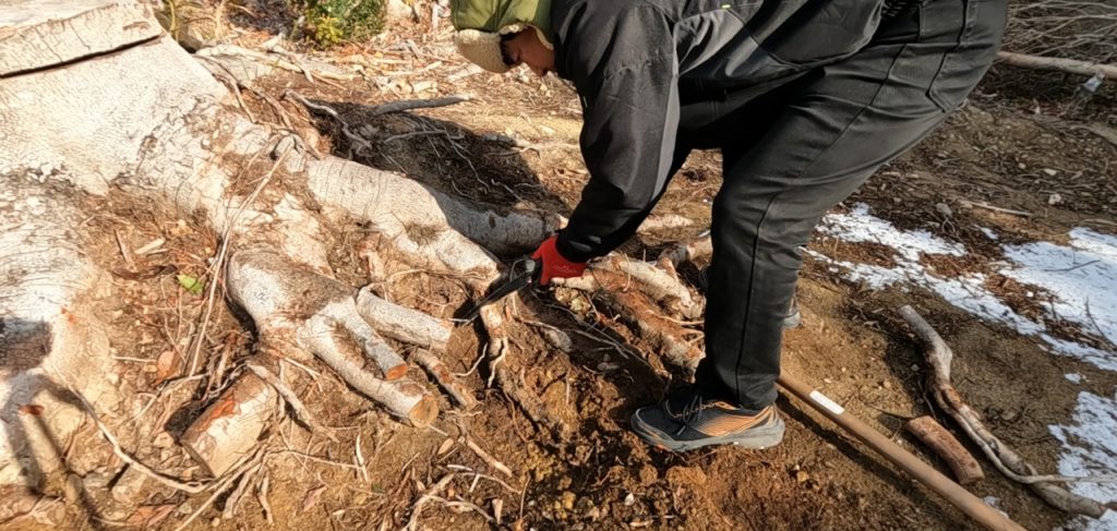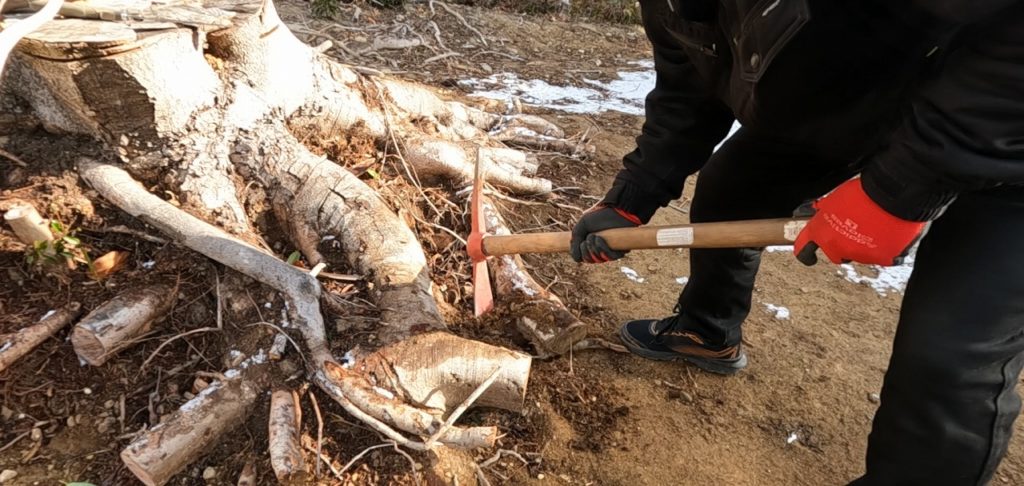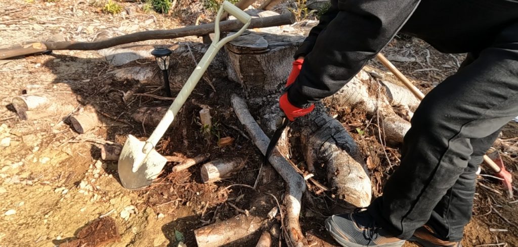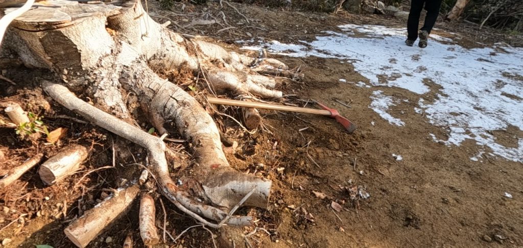 大きな切り株の裏側の根が張り出している部分を掘り起こし、根を切り離していきます。根は横に広がっているので、掘り起こすのが大変な作業です。