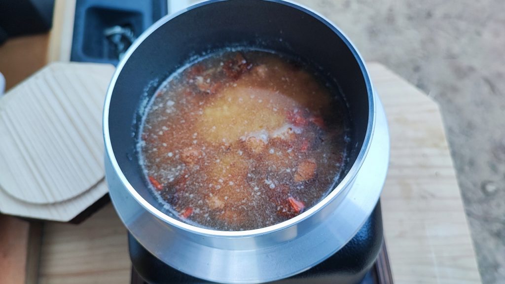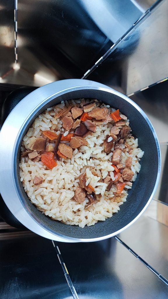 固形燃料で25分くらいで炊きあがり、20分ほどそのまま蒸らして出来上がり、メスティンと違い釜が分厚いので温かいご飯が食べれたおかげで、体の芯から温まりました。
