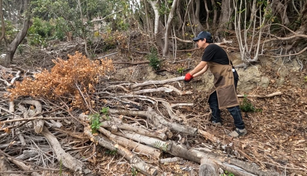 お腹も満たされたところで、そろそろ作業開始!作業服に着替えて、昨日からの続きで伐採木の片付けに取り掛かります。これがなかなか骨の折れる作業なんですが…