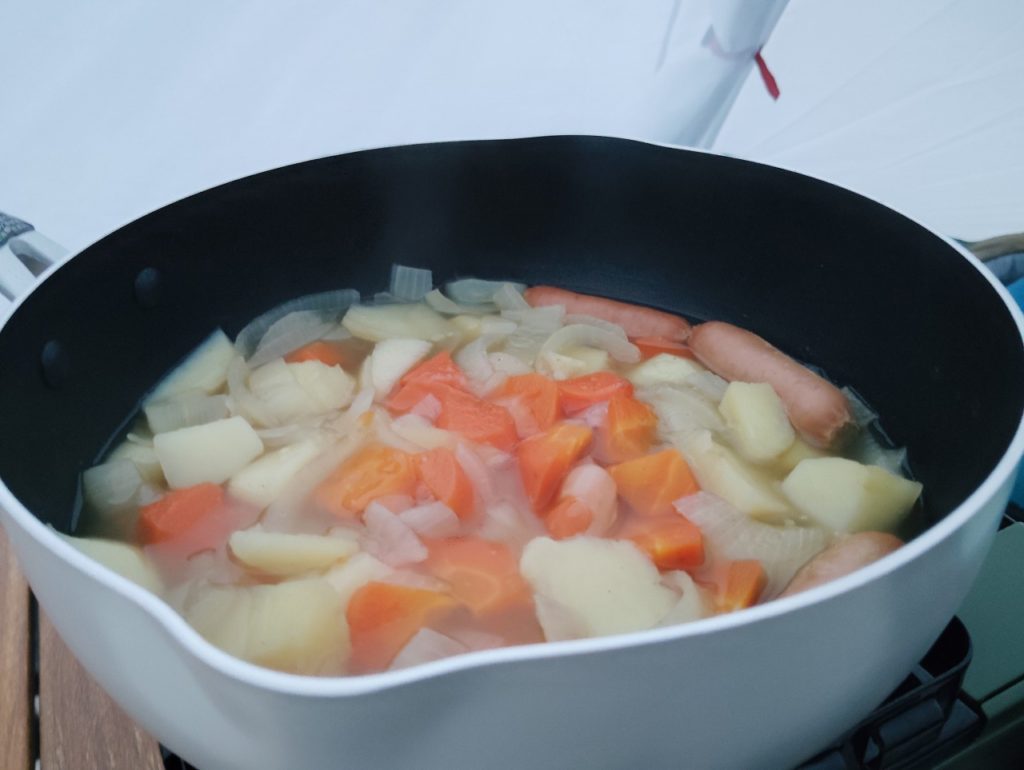 夜になり、テントの中で夜食の準備です。昨日切っておいた玉ねぎ、人参、ジャガイモを使わないと!ということで、シンプルにコンソメスープを作ってみました🍲