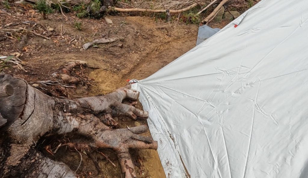 さらに、今晩から明日にかけての豪雨に備えて、テントの周りに雨水を逃すための溝を掘っておきました。これで少しは安心かな?
