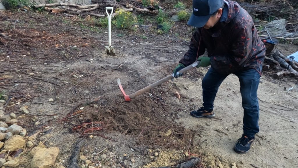 雨で地面が柔らかくなっているうちに、前回のDIYの続きに取り掛かります!ツルハシとスコップを手に、前回掘った場所の仕上げ作業を開始。予想通り、雨で湿った地面は柔らかく、前回苦労した岩盤付近の土も、幾分か掘りやすくなっています。