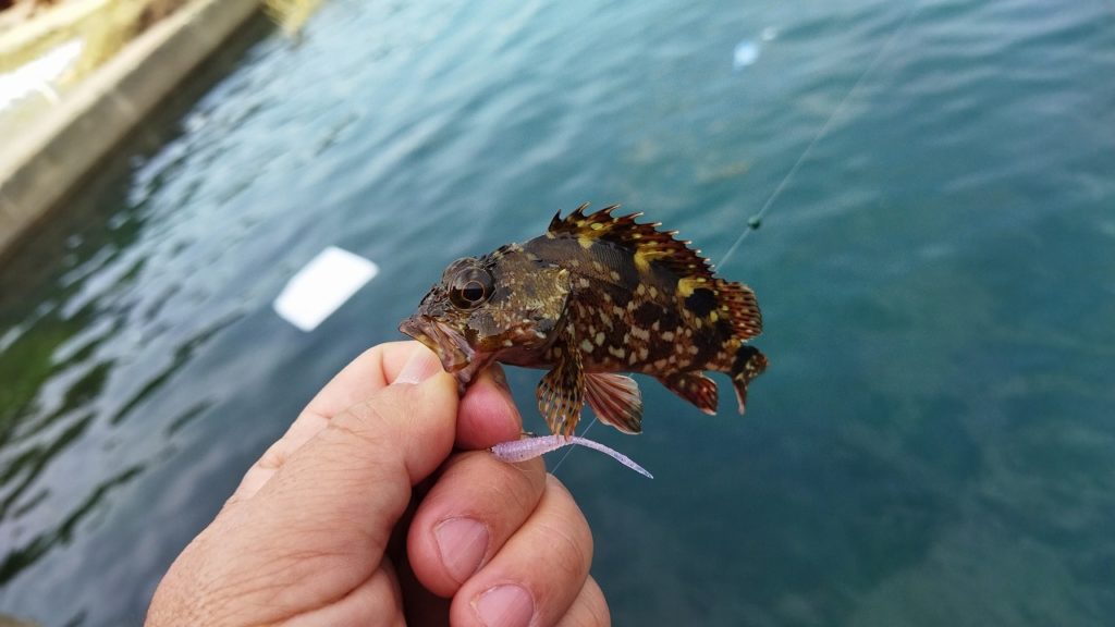 魚影は濃いものの、なかなかアタリがありません。それでも諦めずにキャストを繰り返していると…ついに、グッと重たい感触が!上がってきたのは、やや小ぶりなガシラさんでした🐟
