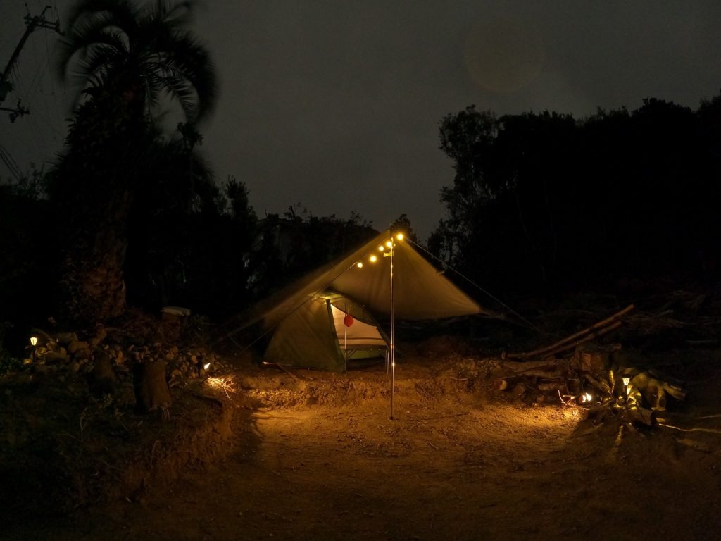 ふと目が覚めると、なんと夜中の0時。トイレに行こうとテントの外に出てみると、100均のソーラーライトが想像以上に良い雰囲気を醸し出していて、思わずテントの写真をパシャリ。なかなかご満悦な光景に、笑みがこぼれてしまいます。