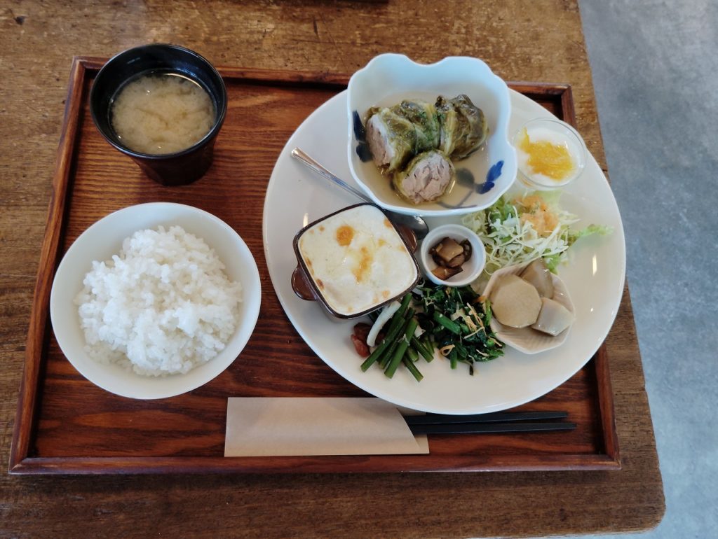 そうこうしているうちに、お待ちかねの料理が運ばれてきました。メインは優しい味わいのロールキャベツ。それに、ご飯、ニンニクの芽の梅干し和え、サラダ、そしてデザートにはヨーグルトとオレンジマーマレード。このヨーグルトのさっぱりとした酸味とマーマレードのほのかな苦みが絶妙にマッチしていて、とても爽やかな味わいでした。そして何より驚いたのが、ニンニクの芽と梅干しの組み合わせ!こんなに合うとは思いませんでした。今度、家でも試してみよう😋