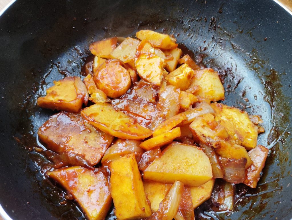 作り方は簡単!チューブニンニクと生姜、タマネギを油で炒め、香りが立ったら豆板醤と甜麺醤を大さじ半分ずつ投入。水100mlを加えて、ジャガイモとサツマイモに火を通していきます。今回は、さらにオイスターソース大さじ一杯と、味の素の中華味を少々で味を調えてみました。