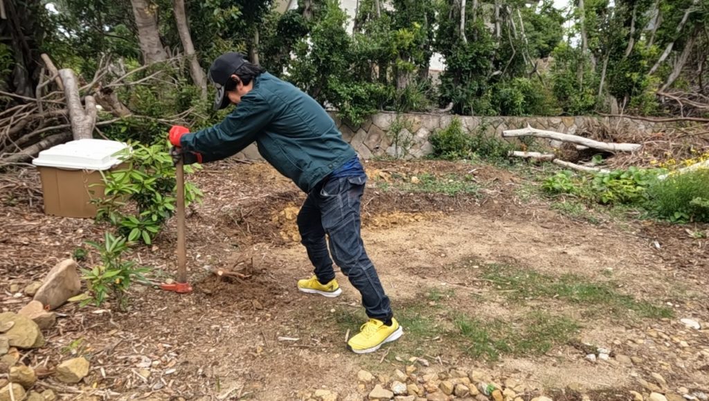 崩しやすい今のうちに、広げておく作戦です!その後、先日購入したローズマリーを植え込み、いよいよ柵作りの本番へと移ります。