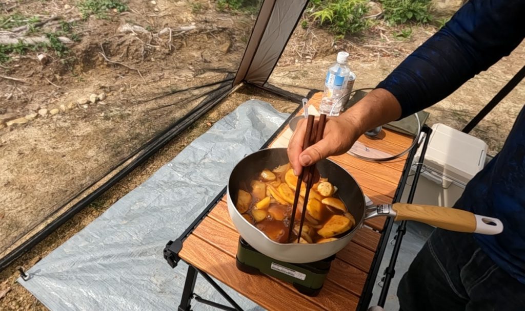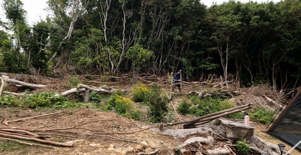0円放置リゾート地を夢のプライベートキャンプ場に!いよいよ大詰め【2025年5月活動記録】3日目 – 雨上がり決行!秘密基地拡張&絶品麻婆風芋料理!