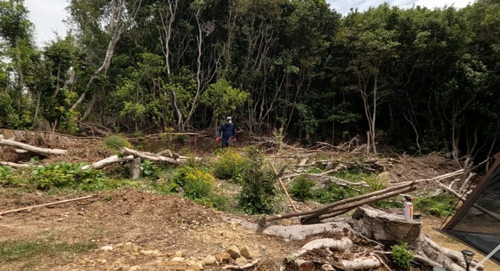 最初、ここで作業を始めた時は「寝れる場所が確保できれば良いや〜」と思っていたのですが、どんどん欲が出てきて、ちょっと良い感じのキャンプ場が出来てきた気がします👍 あと、もうひと頑張りだ〜!