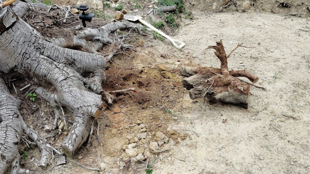 キャンプ場に戻ってからは、気になっていた木や雑草の残りを片付けました。ついでに、大きな切り株の根っこを切り落としてみたのですが、これがめちゃくちゃ辛い作業でした。