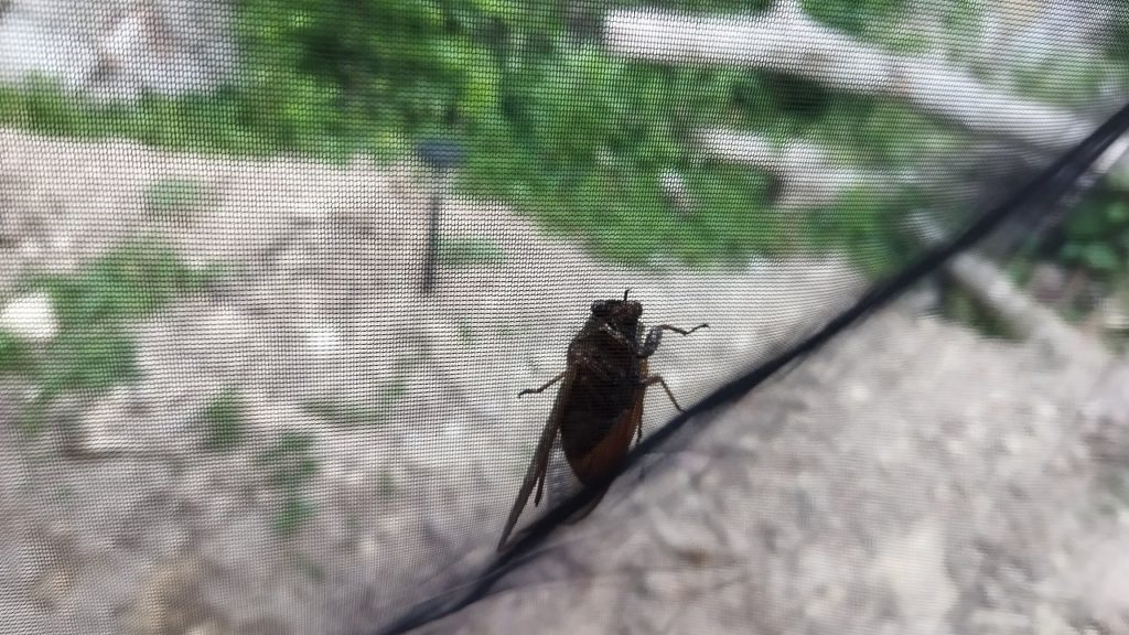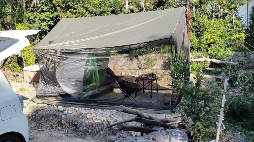 タープは朝露で濡れていて、なぜか孵化したばかりのセミが止まっています。