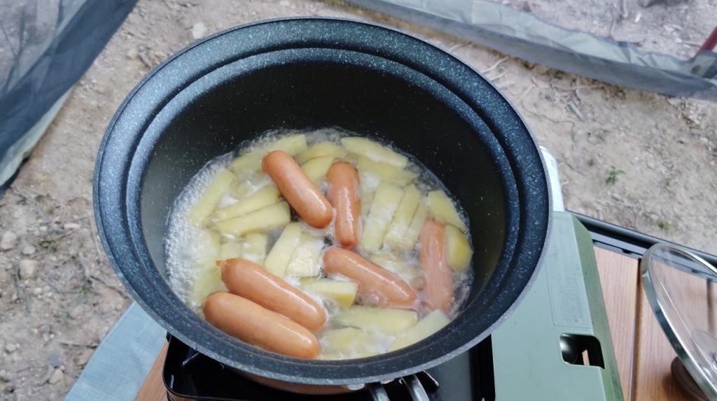まずは朝ごはんに、昨日の残りのジャガイモとウインナーを使ってコンソメスープを作って食べました。コンソメスープは残った野菜などを入れるだけで簡単に美味しくなるので、僕のようなズボラなキャンパーにはぴったりです😁