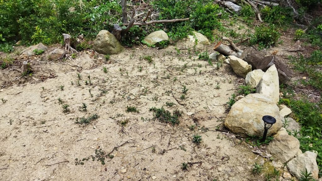 管理人さんに挨拶を済ませて中に入ると、やっぱり雑草が育ち放題だ。まずはある程度の雑草を抜いてから、今日の作業に取り掛かった。本日のメニューは、第2サイトの拡張と整地。だけど、暑すぎてなかなか作業が進まない。