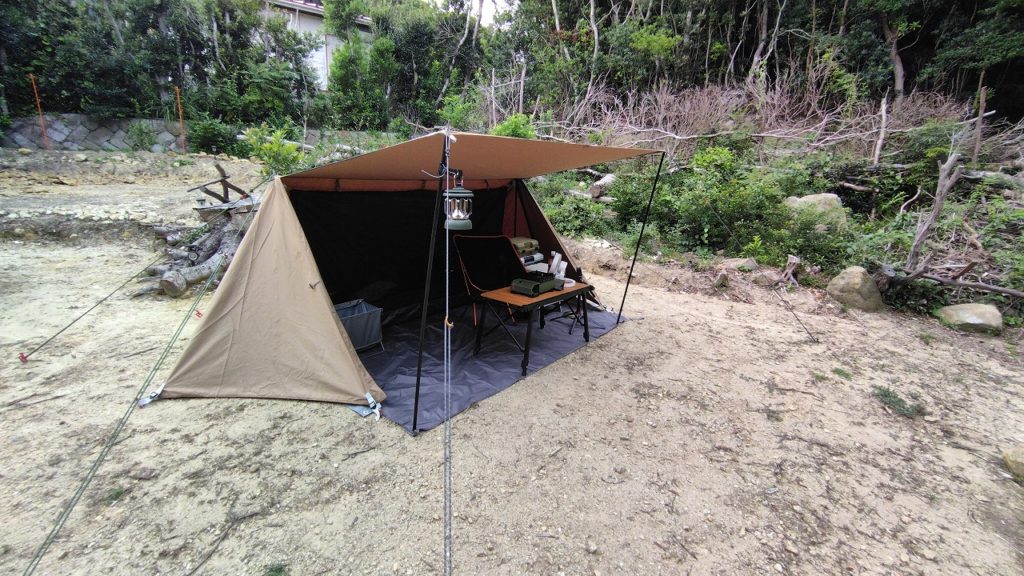 ササッと整地を済ませてからテントを設営するつもりだったけど、作業は一時中断。先にテントを立てることにした。今日のお宿は、山善さんのキャンパーズコレクションのパップテント。買ったまま放置していたので、これが初設営だ。