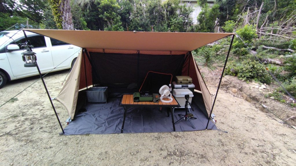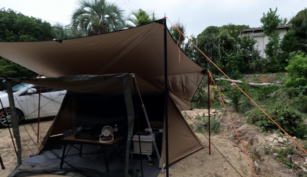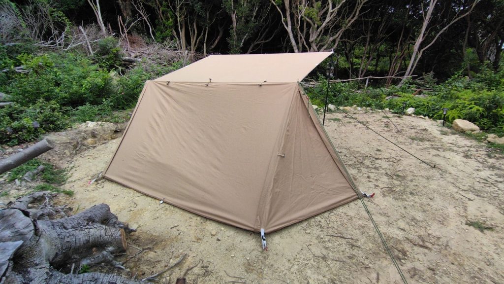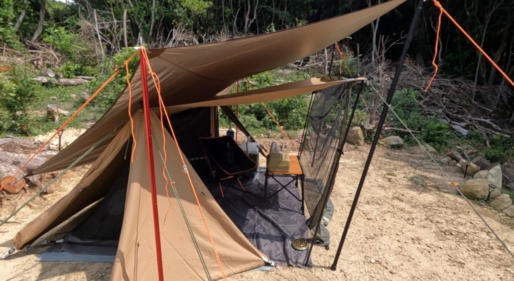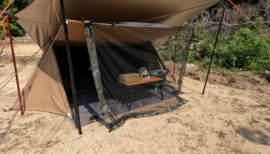 TC生地は夏涼しいらしいし、インナーがオールメッシュなので、この暑さの中ではこのテントが最適だと判断した。この効果は後の検証で確かめるとして……。