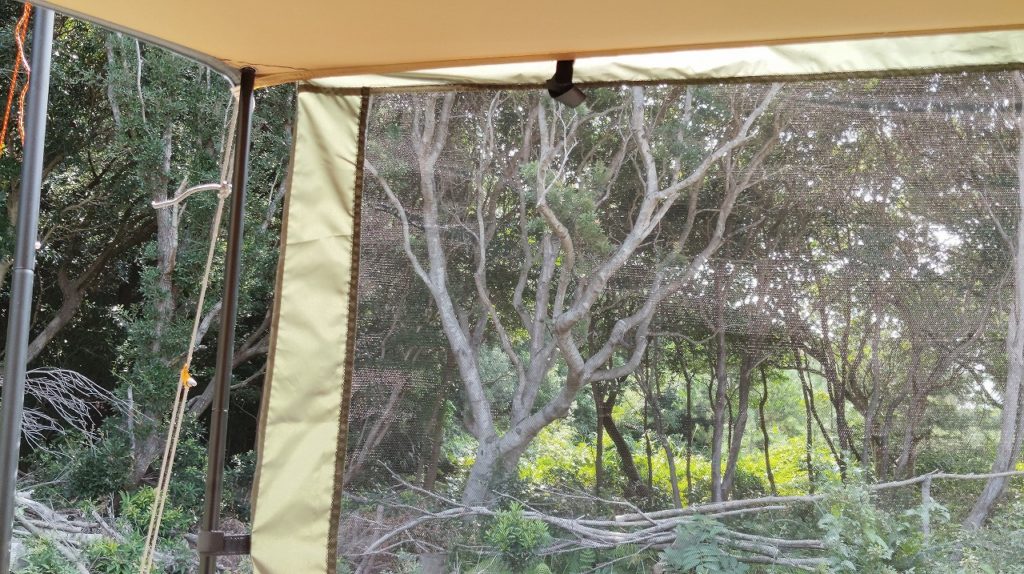 慌てて、ユニジアさんのヘキサタープで過保護張り。これでひとまず安心だ。さらに、カインズで購入したタープ用のメッシュをキャノピーのフロント部分にだけつけてみた。若干丈が足りないのとサイドがないのが少し寂しいけれど、フロントだけでも安心感がかなり増す。次はもっと大きなものを買っておこう。