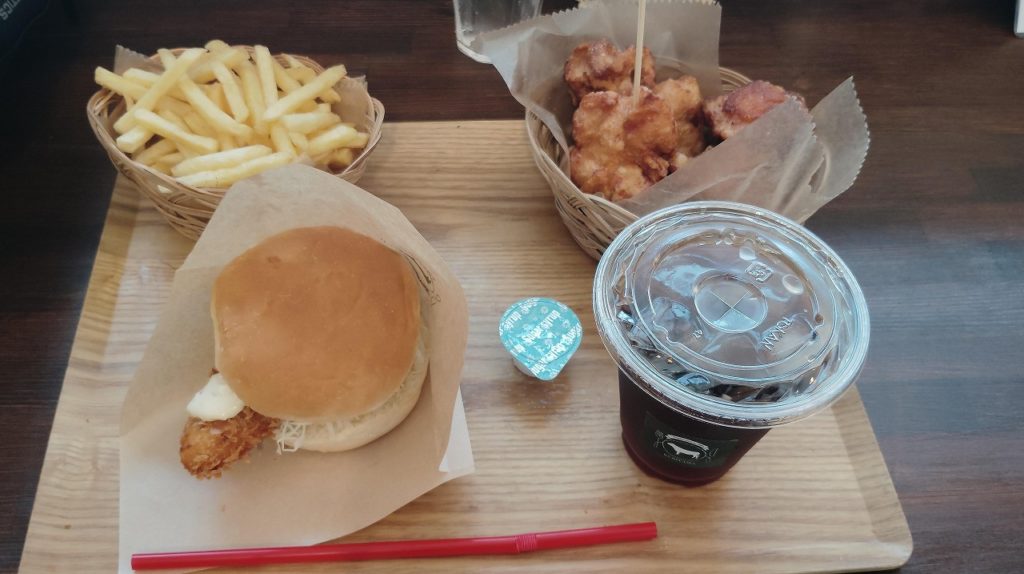 その後はいつもの定番、道の駅「志原海岸 海来館」前にある**「くりやまさん」**へ。釣友と一緒に、ささみタルタルバーガーのからポテトセットをいただきました。この値段でこのボリュームは本当にありがたい😋。特に唐揚げは、お肉屋さんが経営しているだけあって絶品です!