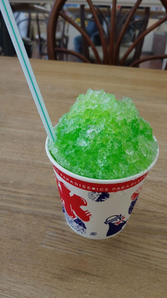 お店もお昼前で忙しくなってきたようなので、サッとたいらげて道の駅へ移動。デザートに大好きなメロン味のかき氷🍧をチョイス!最初は涼しい店内で食べていたけど、「外の方が美味しく食べられるんじゃない?」ということで外へ。思った通り、暑い中で食べるかき氷は格別でした。