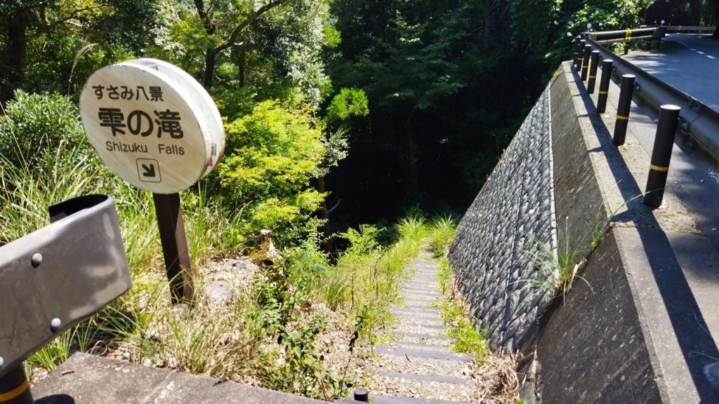 しばらく進むと、「雫の滝」と書かれた看板と、車が数台停められそうな場所に到着。看板脇に整備された階段を下ります。