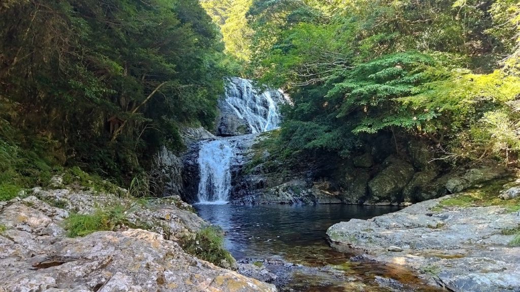 この枝にテンションが上がってしまって、肝心な滝を忘れるところでした。この枝をくぐると、ようやく滝が見えてきます。滝は思っていたより水量があり、幅も広い。珍しい2段の滝で、とても美しく迫力がありました。しかも、下界とは違いめちゃくちゃ涼しい!あまり人も来ない場所なのか、ゴミがないのも良いところです。本当に、いい歳をした大人がポイ捨てをするのは情けない…😭