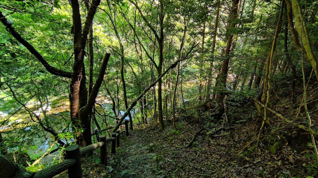 5分ほど下ると、折れた大きな枝が、奇跡的に太いツルでブランコのように吊り下げられていました。御利益がありそうなので、しっかりカメラに収めてきました📷。こんな状況でも落ちない…ということは、受験生には絶好のスポットかもしれない!挫折しそうな人にもパワーをくれそうですね😁