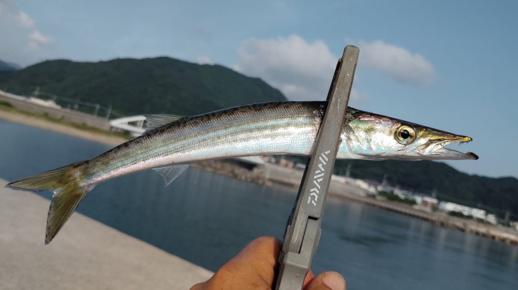 お気に入りのバスロッドに、カマス釣り名人から教わった細めのリーダーをプラスしたダブルリーダーをセット。釣りはまだ日のある午後4時から開始です。「日が沈まないと難しいよ」と地元の方に言われましたが、数投キャストすると良型のカマスがアッサリ釣れました!結構まるまるしているので引きも強く楽しい🥰