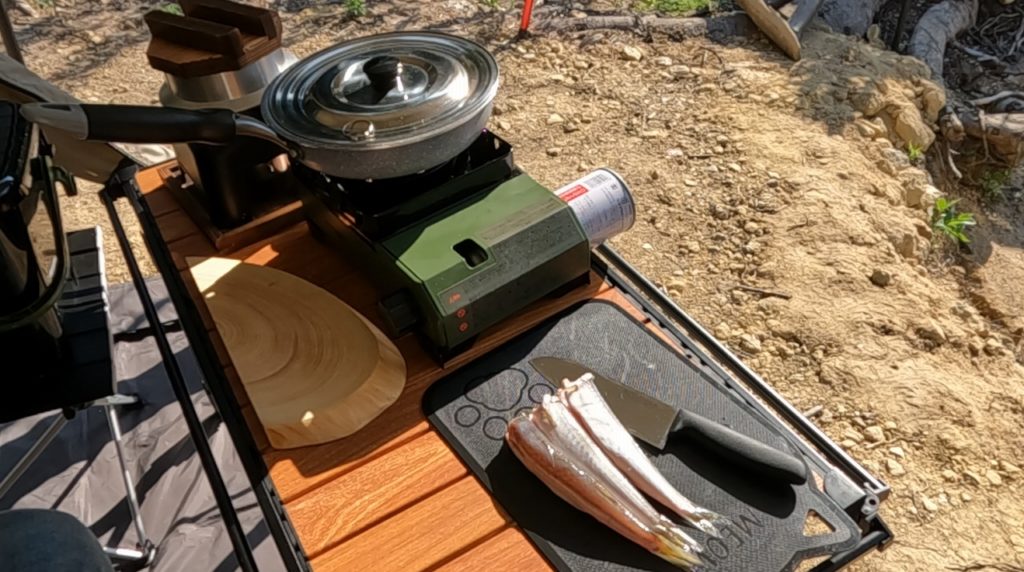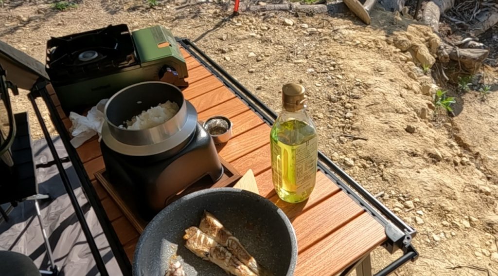 ご飯が炊けて蒸らしている間に、昨日釣れたカマスをフライパンで塩焼きに。油が出てきて、とってもいい匂いがします🤤。味は若干劣ると言われるヤマトカマスですが、カリッと焼き上がった皮目が香ばしくて美味!今回は新鮮な魚の味を堪能したかったので、シンプルに塩だけで味付けしました。