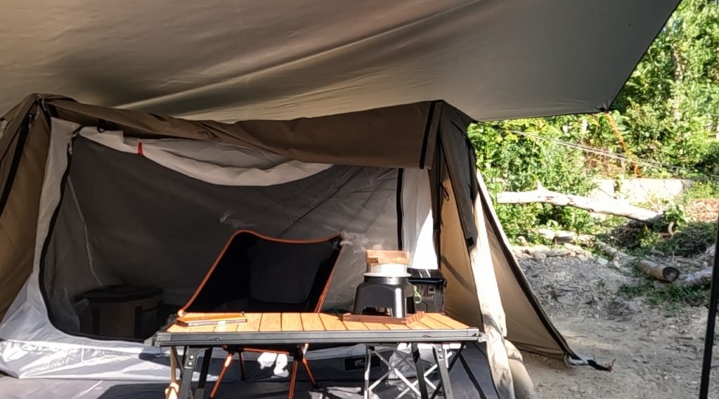 ご飯の後片付けを終えて、次はテントの片付け。日が昇ったおかげで、朝露で湿っていた部分が一瞬で乾きました。こちらも日干しになりそうなくらい暑いけど😅