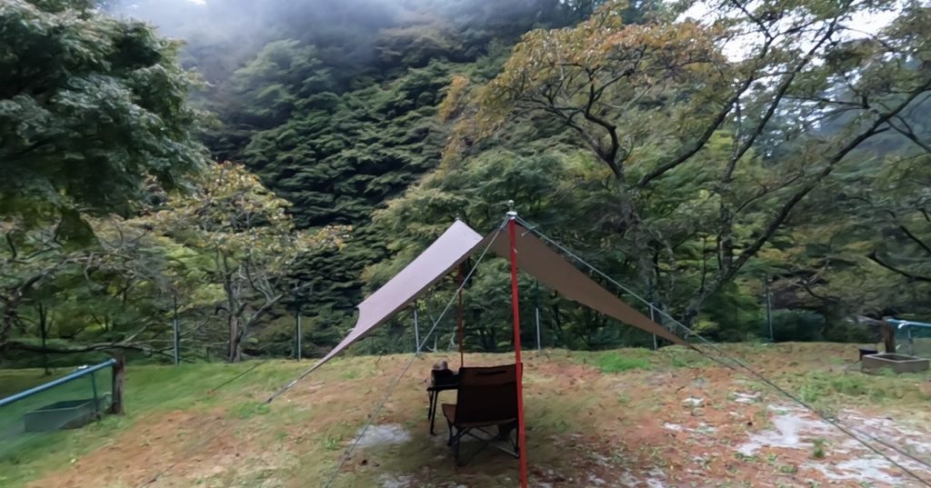 雨脚が強く、今回はテント泊を諦めました。明日の釣りに集中するため、雨で濡れたテントを撤収する時間を省くための車中泊を決断!最低限の雨除けとしてタープだけを設営することに。