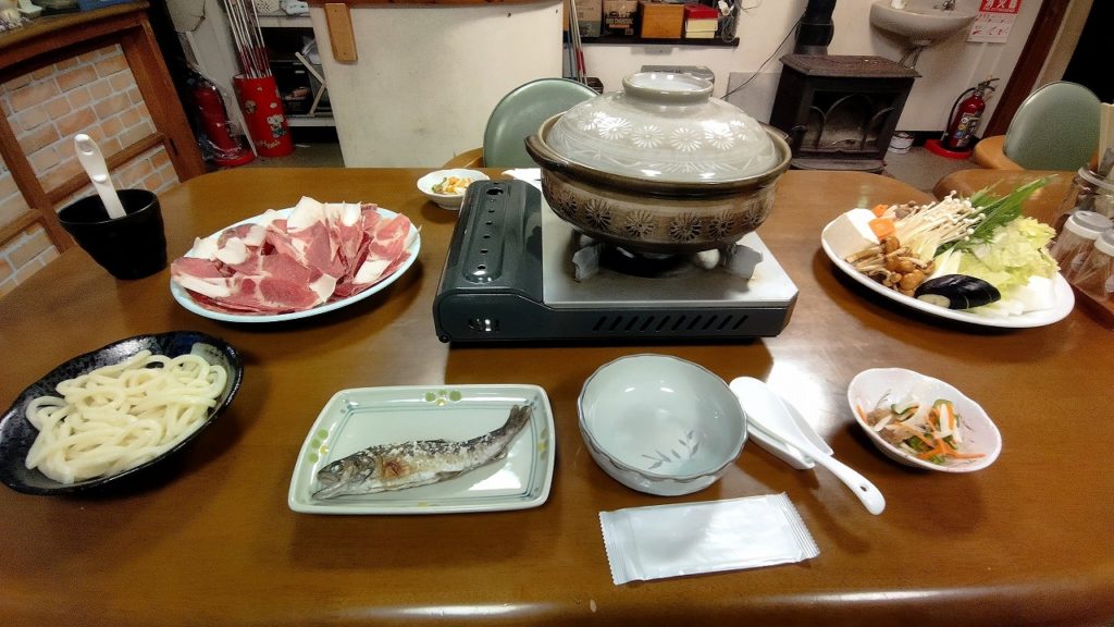 気持ちよくなりあたりも真っ暗になった頃、かわらび荘に戻り、お待ちかねの夕食です。