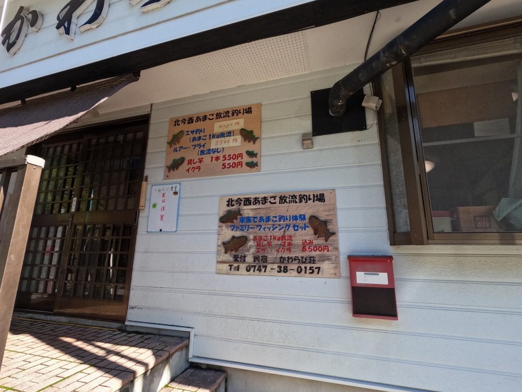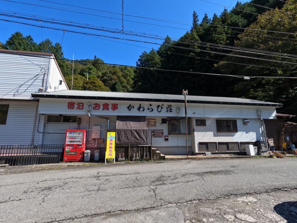 山道を50分ほど走り、「かわらび荘」に到着。アマゴ釣りとキャンプサイトの料金を支払い、車でサイトへ。
